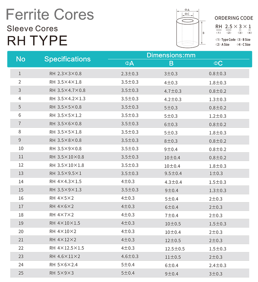 RH 시리즈 EMI 억제 페라이트 비드 튜브 코어는 원형 케이블 권선에 일반적으로 사용되며, 특히 1MHz~500MHz의 고주파수 대역에서 간섭 방지 효율을 얻는 데 최적이며, 케이블 직경 1mm~20mm에 적합합니다.